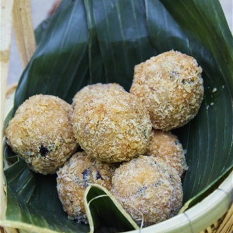 Khoai sọ bọc thịt chiên xù với khoai sọ dẻo bùi sau khi được hấp chín, trộn cùng với thịt heo bằm và nấm mèo, chiên giòn rụm, có thể ăn kèm với tương ớt.