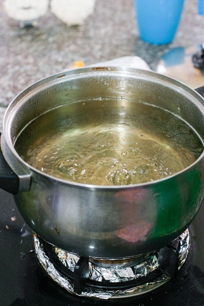 1. Để thực hiện cách làm bánh trung thu rau câu nhân flan, đầu tiên bạn cho 1,5 lít nước, rau câu với 500gr đường vào nồi, khuấy đều. Cho nồi lên bếp đun sôi. Khi hỗn hợp sôi, vặn nhỏ lửa để nước trong nồi sôi nhẹ, rau câu không bị đông.