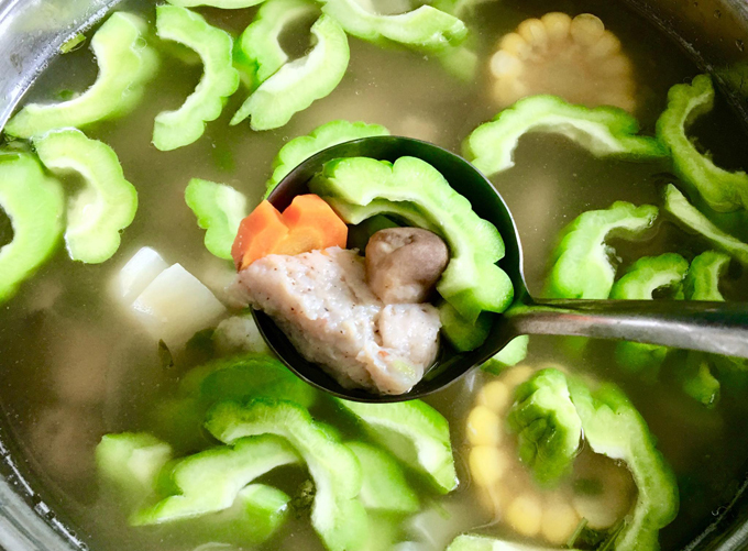 – Khổ qua rửa sạch thái lát vừa ăn. Cà rốt và củ cải trắng tỉa hoa thái lát dày. Bắp ngô thái khúc. Nấm rơm làm sạch, rửa lại với nước. Thịt, xương rửa sạch.
