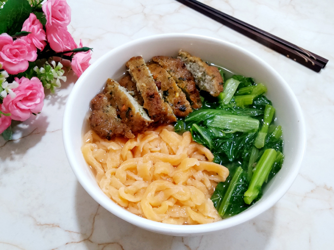 Tự làm mì tươi chả cá rau cải khá đơn giản mà ngon miệng. Sợi mì mềm ngon, màu cam bắt mắt, kích thích vị giác, có thể đổi món cho bữa ăn gia đình.