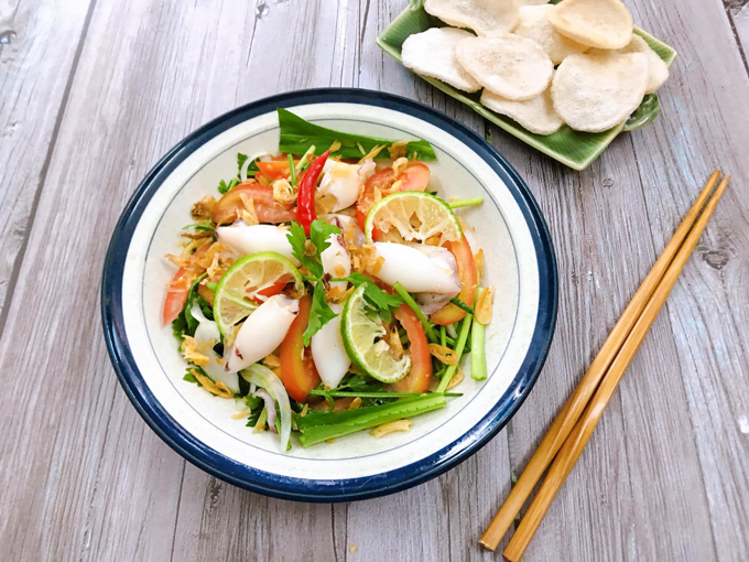 Mực sữa giòn sần sật, kèm các loại rau thơm mát hấp dẫn. Món gỏi còn thể giúp kiểm soát cân nặng và tốt cho sức khoẻ.