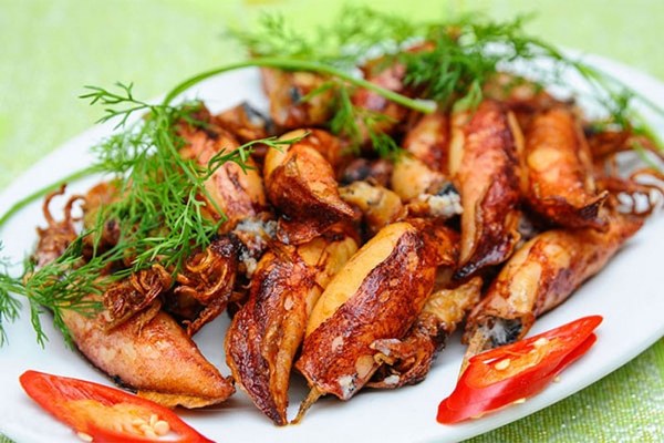 Bước 5: Tiếp theo bạn hãy đổ bớt dầu trong chảo vừa chiên mực ra 1 cái bát con đun nóng chảo dầu rồi cho số tỏi đã băm vào trong chảo phi thơm và cho mực cùng với số gừng đã thái vào trong chảo đảo thật đều. Sau đó bạn cho số nước mắm đã pha ở bước 3 vào trong chảo đảo đều. Bạn hãy đun khoảng 2 – 3 phút cho phần nước mắm cạn bám xung quanh mực và mực chuyển sang màu vàng cánh gián thì lúc đó bạn hãy tắt bếp. Cuối cùng các bạn chỉ cần cho mực ra đĩa rồi dùng nóng ăn với cơm. Để cho món mực chiên nước mắm thêm thơm ngon độc đáo hơn thì các bạn hãy chuẩn bị thêm chút rau mùi trang trí lên đĩa mực chiên nước mắm và 1 đĩa tương ớt để chấm cùng với mực.