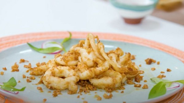 Món mực lá chiên giòn cháy tỏi có cách chế biến vô cùng đơn giản. Mực vàng giòn, ăn cùng với tương ớt sẽ rất hấp dẫn.