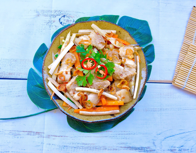 Ngó sen, cà rốt giòn ngọt, thịt béo mềm. Đây là món xào thanh mát, hấp dẫn trong mâm cơm của cả nhà. Ngó sen có vị ngọt, tính hàn, giúp thanh nhiệt, cầm máu. Không chỉ được chế biến thành các món gỏi giòn mát, ngó sen xào thịt cũng ngon không kém.