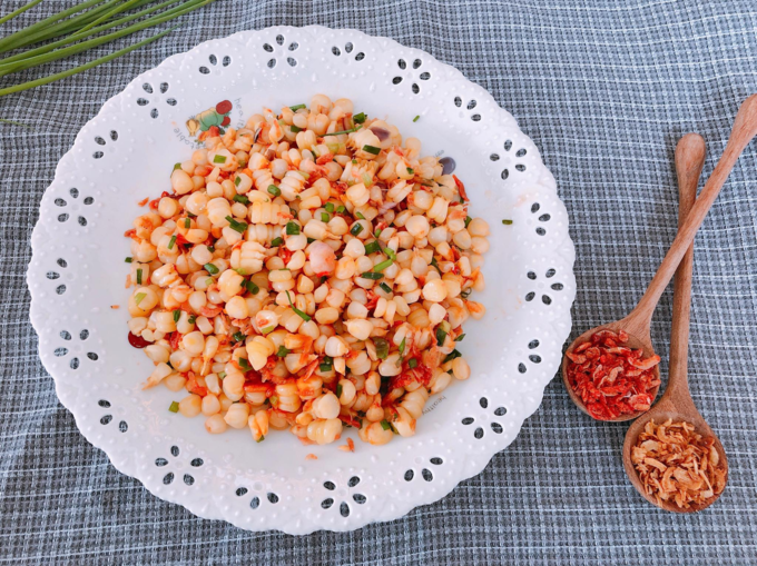 Món ngô xào bơ phi cùng hành và tương ớt làm thức ăn vặt ngày đông rất hợp.