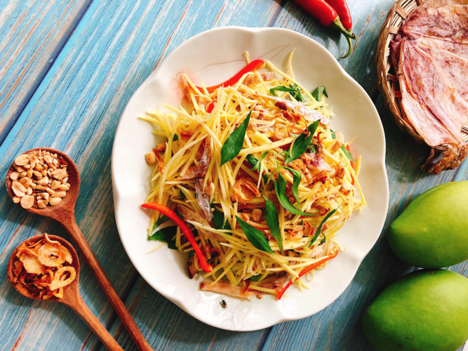 Xoài xanh thái nhỏ, vị giòn giòn trộn với khô mực dai dai, đậm đà gợi nhắc về một món ăn vặt thời học sinh.