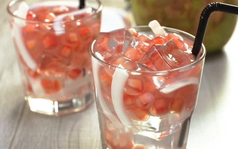 Dừa tươi nạo vỏ, rửa sạch, sau đó cắt thành các hạt lựu nhỏ, rồi ngâm chung với nước củ dền 20 phút để tạo màu đẹp.