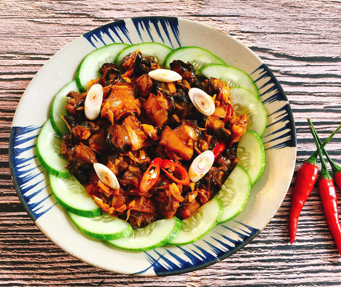 Ốc bươu xào giòn giòn, thơm mùi cà ri, đậm đà vị sả ớt, ăn cùng cơm nóng hoặc làm món nhắm cũng hợp lý.