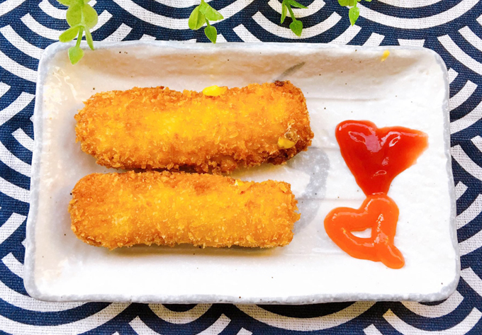 Phô mai bên ngoài giòn rụm, bên trong thơm béo đậm vị, chấm cùng tương ớt, tương cà, là món ăn vặt cả nhà cùng mê.