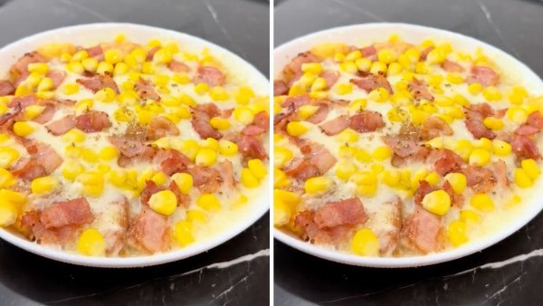 Tiếp đến, bạn cho bắp Mỹ, thịt xông khói lên trên mặt rồi đặt bánh vào trong lò vi sóng và bật chế độ nướng trong 1 phút là hoàn thành rồi đấy!