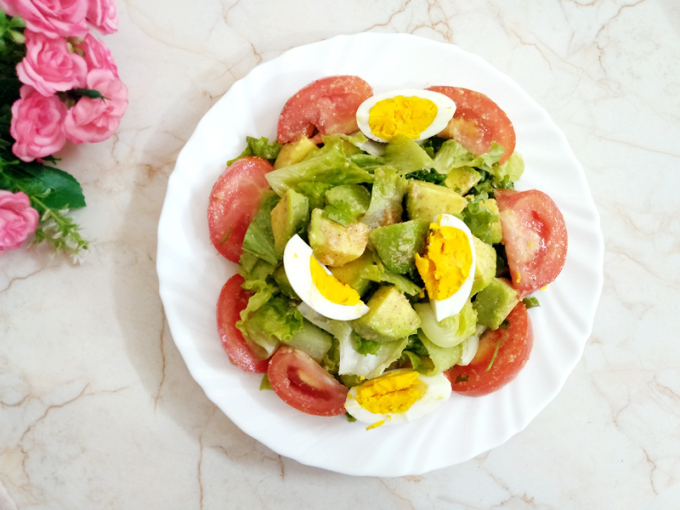 Món salad vị giòn ngọt của rau quả, lại thơm ngậy vị xốt mè rang, ăn kèm trứng luộc ngon miệng. Món ăn rất thích hợp dùng thay cho bữa cơm tối trong chế độ ăn kiêng giảm cân.