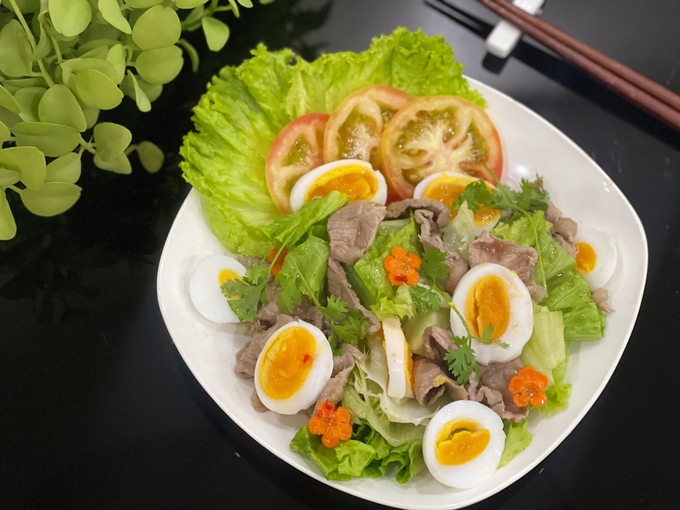 Vị ngọt từ thịt bò, vị béo của trứng lòng đào quyện vào xà lách tươi giòn khiến món salad mang vị hài hòa, thanh mát, thêm phần nước sốt chua chua ngon miệng. Đây vừa là món khai vị lý tưởng vừa phù hợp với những chị em đang theo đuổi chế độ eat clean.