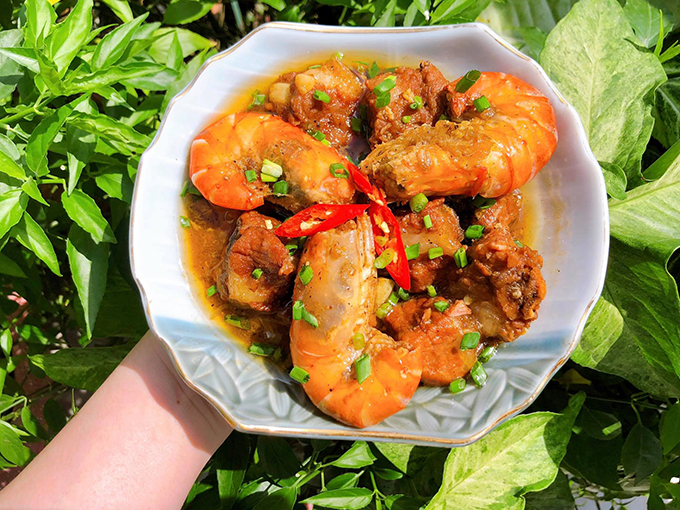 Sườn kho tôm vị đậm hấp dẫn, sườn mềm, tôm tươi ngọt hoà với nước kho sệt đậm đà đưa cơm.