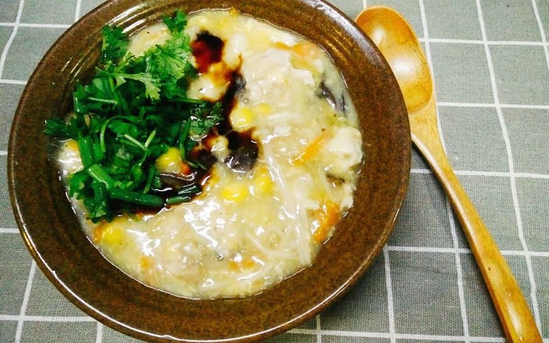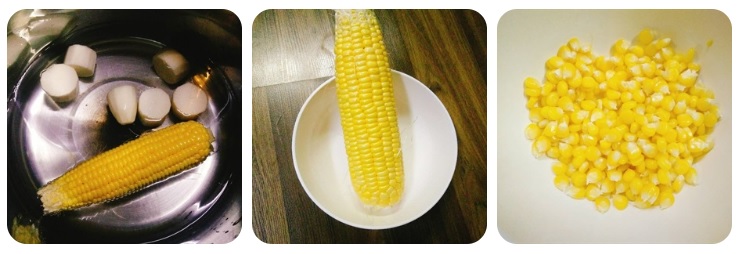 Nấu nước dùng: Rửa sạch củ cải trắng và cắt khúc cho vào nồi nước, cho nguyên trái bắp Mỹ đã bóc vỏ vào nấu chung. Nấu tới khi bắp chín thì vớt ra để nguội và lấy hết phần hạt bắp, cùi bỏ đi. Riêng củ cải thì vẫn tiếp tục nấu.