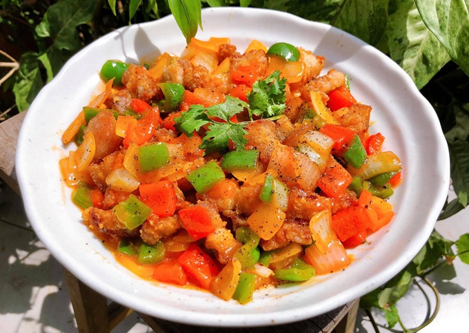 Thịt giòn bên ngoài, bên trong vẫn giữ độ ẩm mềm, hoà cùng sốt chua ngọt, rau củ giòn mát.