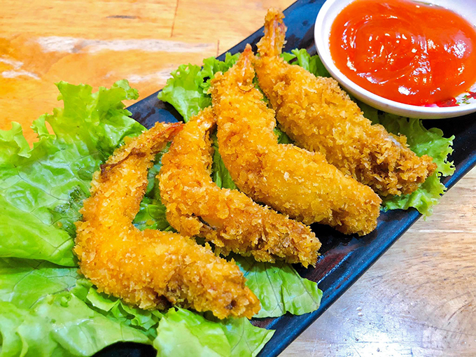 Món tôm chiên xù làm món ăn chơi, món nhậu đều rất ngon. Lớp vỏ giòn tan, thịt tôm bên trong tươi ngon, chấm kèm tương ớt.