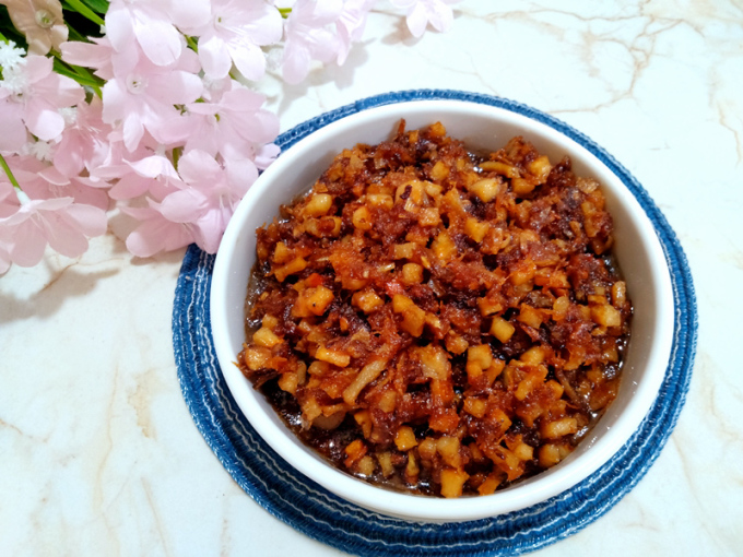 Ngâm tôm khô với nước cho mềm, rồi xay nhỏ. Giò thái hạt lựu. Đổ dầu ăn vào chảo, cho giò, tôm xay, chà bông vào chiên ngập dầu đến khi chuyển màu ngả vàng thì vớt ra bát.