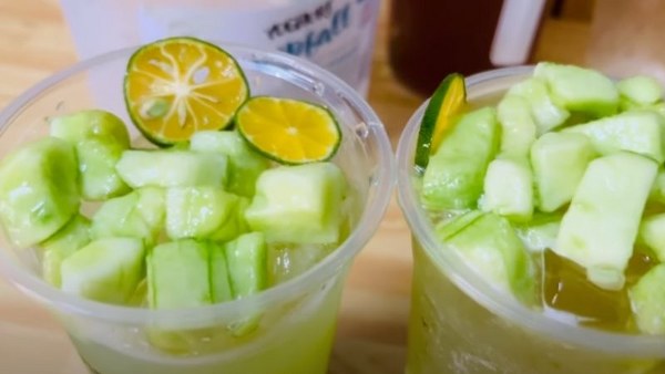Cuối cùng, bạn cho nước ra ly, thêm đá viên và dưa gang lên trên là hoàn thành.