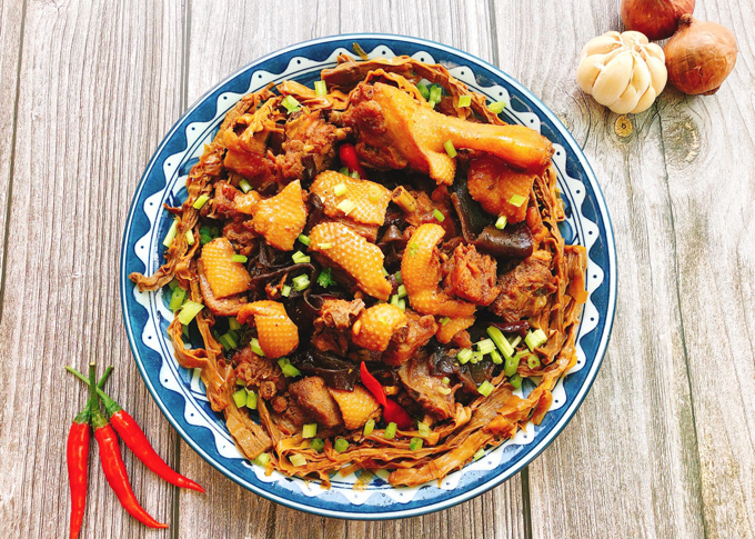 Thịt vịt mềm, được khử sạch mùi, kho với măng khô đậm đà, thơm mùi hành tỏi phi, ăn kèm chút ớt tươi và cơm trắng.
