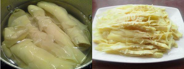 – Măng mua về rửa sạch, cho vào nồi luộc sôi 10 phút, khi luộc mở vung để độc tố bay hơi. Luộc xong vớt ra rửa lại với nước. Làm lại 2-3 lần như vậy ăn sẽ đảm bảo hơn.