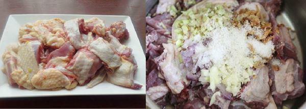 Vịt chặt vừa miếng cho ướp chung với hành khô và sả băm nhỏ, 1,5 thìa muối, ½ thìa hạt nêm, một chút nước mắm, mì chính, đường, đó trộn đều để 20 phút cho ngấm gia vị. Ướp thịt hơi đậm một chút để khi nấu chế thêm nước sẽ vừa ngon hơn so với nấu trực tiếp rồi nêm gia vị.
