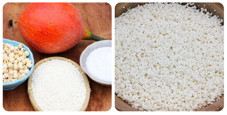 Gạo nếp 500 gr, gấc 1 trái, hạt sen khô 200 gr, đường trắng 25 gr, muối 5 gr, dầu ăn 2 muỗng canh, mè trắng 15 gr.