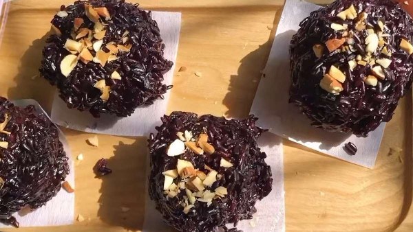 Với phần bột năng màu tím, bạn cũng chia thành 4 phần, cán dẹt ra rồi bọc kín viên nhân vào bên trong. Cuối cùng, bạn lăn viên bột qua lớp gạo lứt đen cho gạo bám đều khắp mặt ngoài.