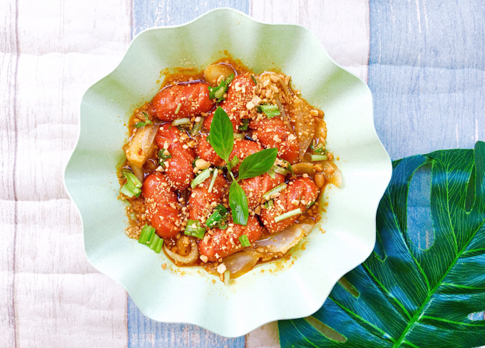 Xúc xích trở nên lạ miệng và không nhàm chán khi có sốt me chua ngọt, đậu phộng béo bùi hấp dẫn.