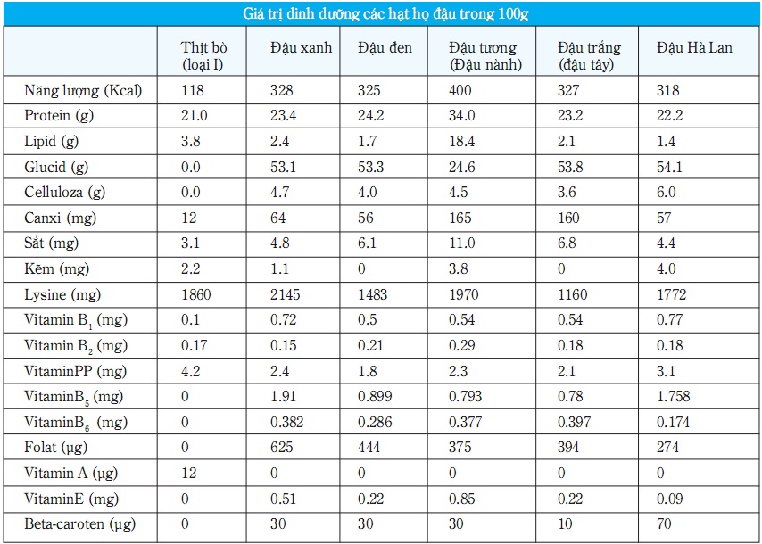 Các loại họ đậu là loại thức ăn có nguồn gốc thực vật, có giá trị dinh dưỡng cao, đặc biệt là đậu tương. So sánh giá trị dinh dưỡng của các hạt họ đậu với thịt bò (loại 1) thì thành phần giá trị dinh dưỡng của các loại đậu nhiều, đầy đủ và cân đối hơn thịt bò. Trong khi đó, để mua 1 lạng thịt bò thì giá tiền lại gấp 10 lần so với đậu tương, khác biệt duy nhất của 2 loại thực phẩm đó là nguồn gốc thực vật (đậu tương) và động vật (thịt bò).