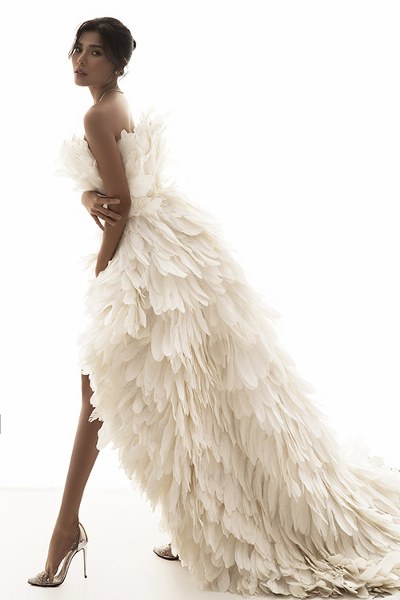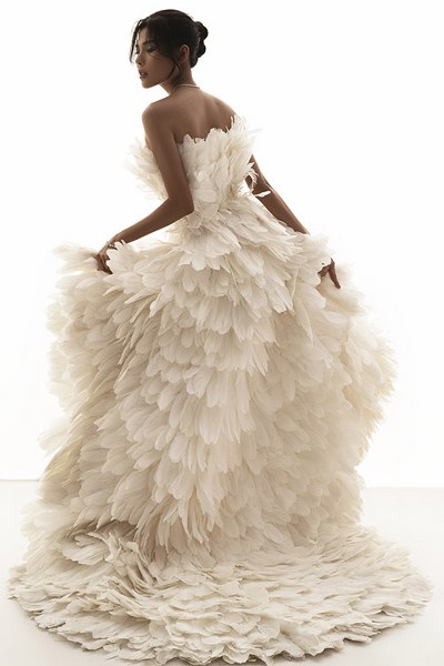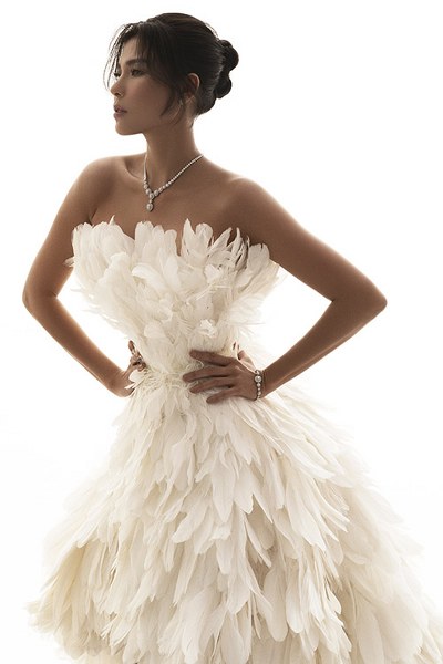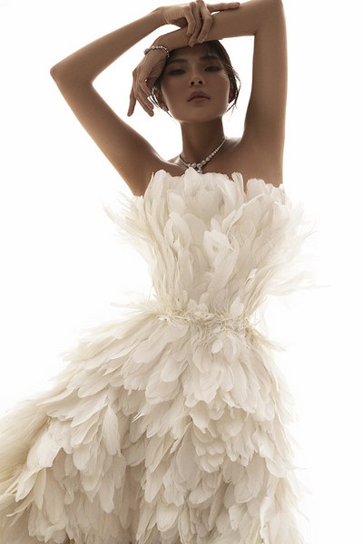 Diễn viên Thuý Diễm hóa nàng chim công xinh đẹp trong bộ cánh lông vũ hở vai, kiểu mullet của nhà thiết kế Lê Thanh Hoà.