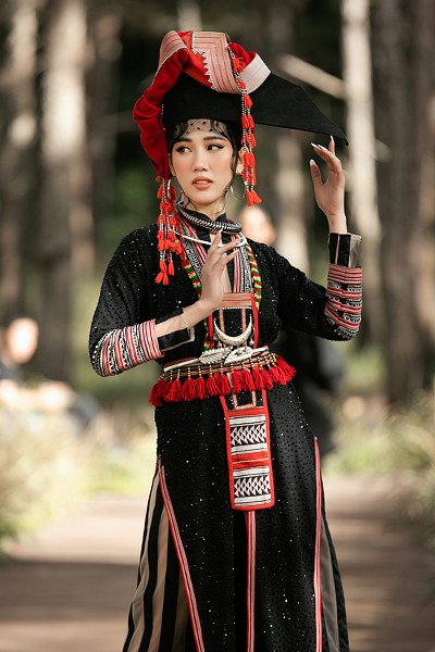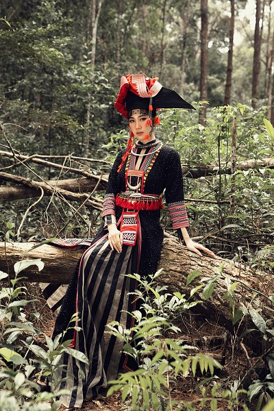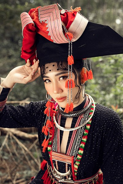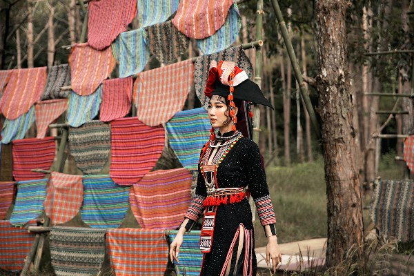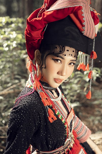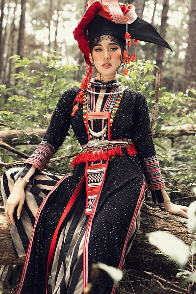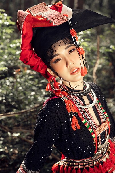 Thúy Ngân trông khác lạ với trang phục thổ cẩm do Lý Quí Khánh thực hiện
