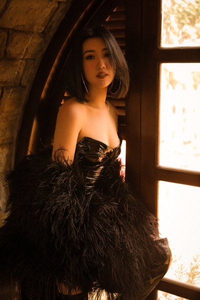 Chiếc váy hai dây kết hợp mốt không nội y giúp Thuý Ngân thêm phần cuốn hút