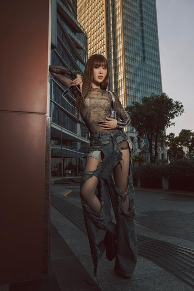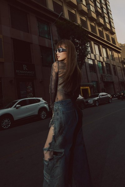 Để thực hiện loạt ảnh với phong cách đường phố, Thúy Ngân không ngại diện áo "xuyên thấu" ôm sát cùng quần jeans rách te tua.