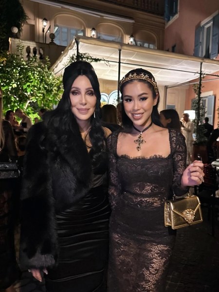 Mới đây, Tiên Nguyễn (phải) chia sẻ hình ảnh gặp gỡ danh ca Cher tại show cao cấp Alta Moda của Dolce & Gabbana ở Italy. Cô diện đầm ren xuyên thấu, phối phụ kiện ánh kim gồm bờm đính đá, túi mini và vòng cổ hình chữ thập.