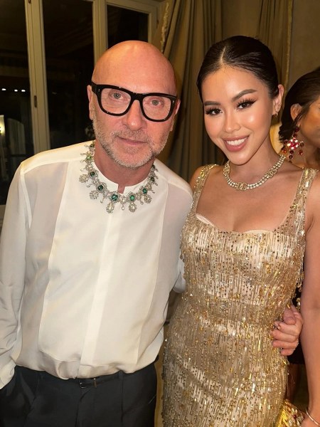 Tại bữa tiệc trước đó một ngày, cô diện đầm đính cườm, bên trong là lớp lót định hình bằng satin. Bên cô, nhà thiết kế Domenico Dolce dùng vòng cổ đính đá ngọc lục bảo làm điểm nhấn cho bộ quần áo đen, trắng tối giản.