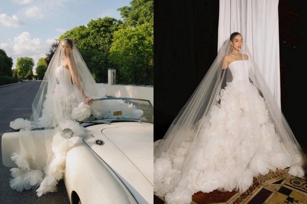 Tiên Nguyễn tạo dáng với đầm cưới đính hoa kết hợp khăn voan