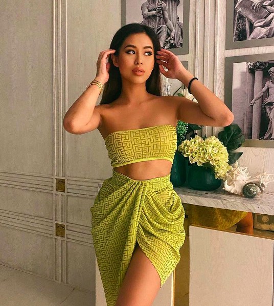 Áo crop-top, chân váy siêu ngắn được mix-match nhịp nhàng từ màu sắc đến phần tạo phom giúp Tiên Nguyễn thể hiện phong cách sexy và cá tính.