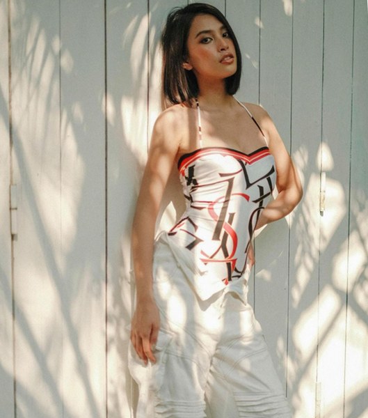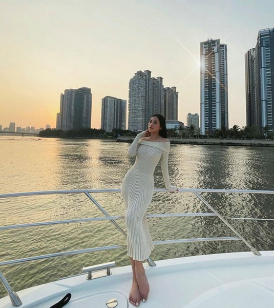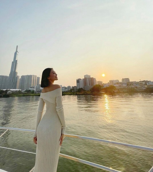 Tiểu Vy thả dáng gợi cảm với thiết kế váy dệt kim mỏng khi ngắm hoàng hôn trên sông Sài Gòn.
