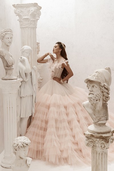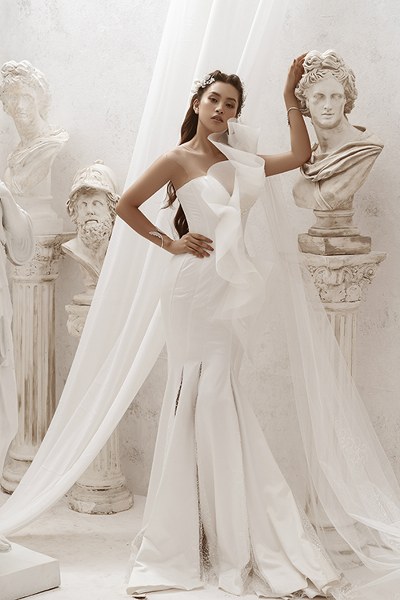 Các váy cưới mà Tiểu Vy diện đều lấy cảm hứng từ đám mây bồng bềnh, có bố cục bất đối xứng tạo sự phá cách.