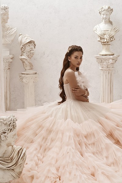 Bộ cánh mang tông màu trong trẻo, được phối vải tinh tế, giúp Tiểu Vy hóa "Nữ thần Hy Lạp" bước ra từ câu chuyện cổ tích.