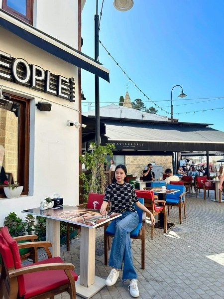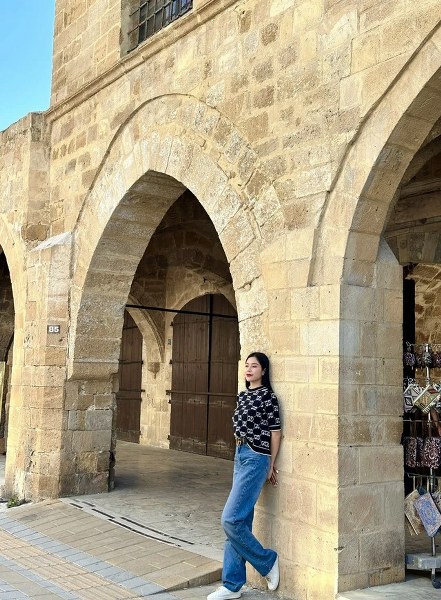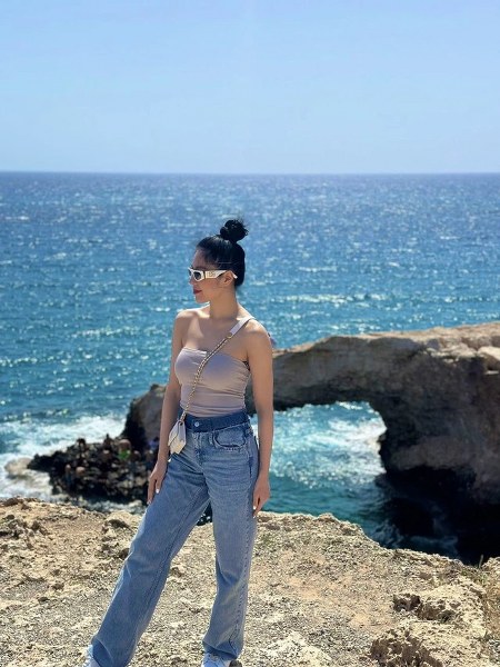 Tại thành phố Nicosia (Thủ đô của Síp), 9X phối đồ khéo léo với áo ống đơn giản, giày sneakers và quần jeans năng động, thoải mái. Cô sử dụng kính mắt và túi đeo nhỏ gọn để có được sự gọn gàng di chuyển suốt hành trình