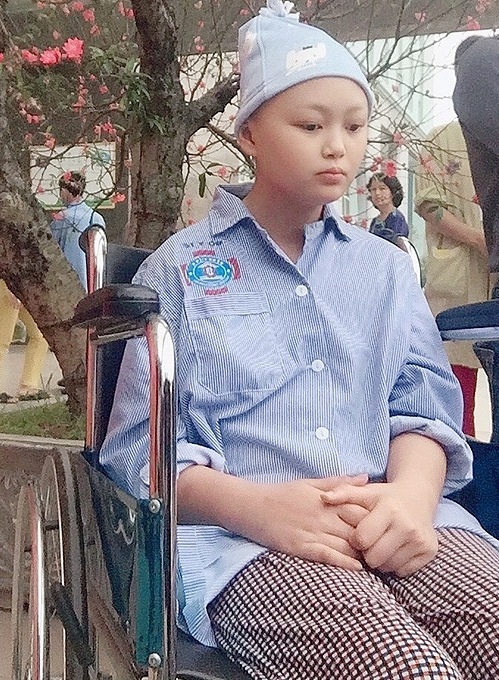 Trải qua 12 đợt hóa trị, gương mặt bầu bĩnh của Linh càng hóp lại, cơ thể gầy gò, xanh xao. Linh ăn vào là nôn, miếng cơm mẹ dỗ mãi em mới cố ăn nhưng vừa nuốt xuống lại trào lên, nước không uống được, thậm chí chưa ăn được gì em lại nôn ra cả dịch xanh vàng trong dạ dày. Mắt không nhìn thấy rõ nhưng con gái chị Duyên biết mái tóc đen óng của mình đã không còn sau khi phẫu thuật.