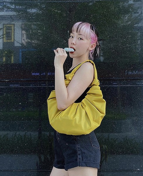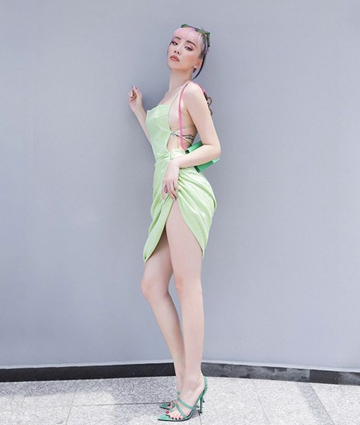 Diện đầm cut-out tôn vẻ đẹp hình thể, Tóc Tiên giúp set đồ dạo phố trở nên hoàn hảo bằng cách mix nguyên bộ phụ kiện tông xanh lá.