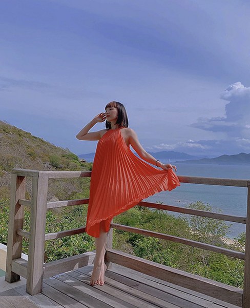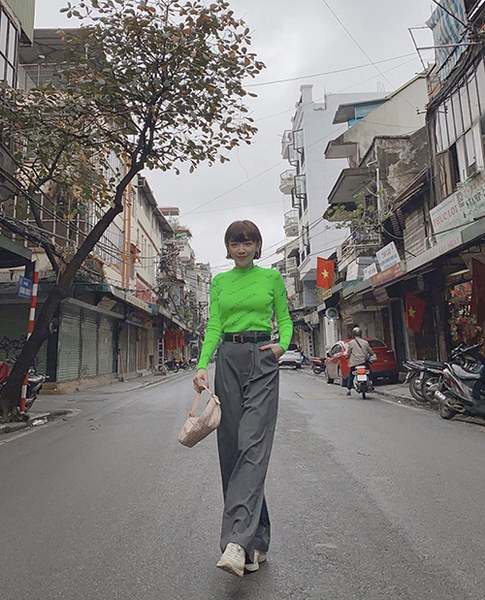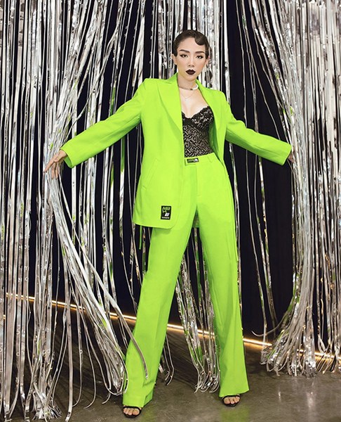 Ca sĩ Tóc Tiên thích sử dụng trang phục gam màu bắt mắt, nổi bật nhất là sắc xanh neon, hồng và đỏ cam được mix-match theo nhiều phong cách.