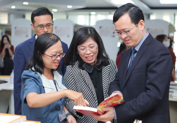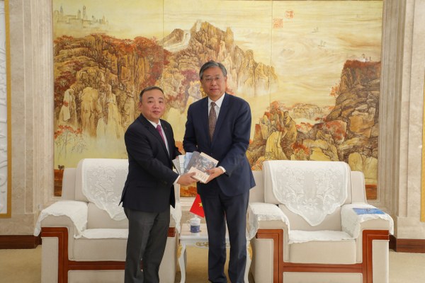 Tổng lãnh sự Nguyễn Thế Tùng trao tặng sách Chibooks (tượng trưng) cho Bí thư Đảng ủy Trường Đại học Ngoại Ngữ Thượng Hải - ông Khương Phong