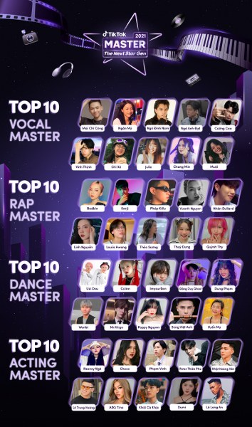 Với hơn 700 video dự thi chỉ sau 1 tuần khởi động, ban giám khảo TikTok Master đã lựa chọn ra Top 40 tài năng thuộc 4 hạng mục chính: #ActingMaster2021 (Diễn xuất), #DanceMaster2021 (Nhảy), #VocalMaster2021 (Hát), #RapMaster2021 (Rap). Các thí sinh sẽ tiếp tục "chạy đua" tại Vòng đồng hành với sự hỗ trợ của 4 ban giám khảo giàu kinh nghiệm: Erik, Quang Đăng, BB Trần và Pháo.