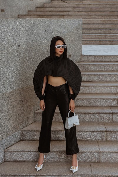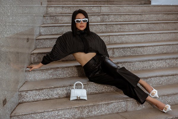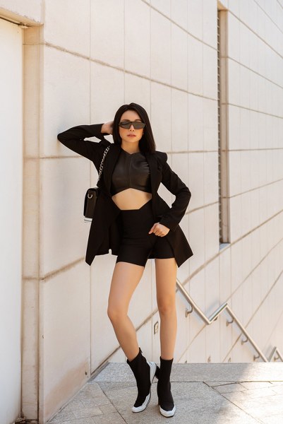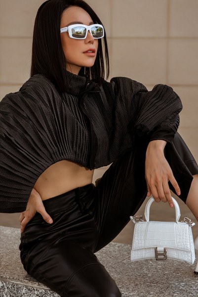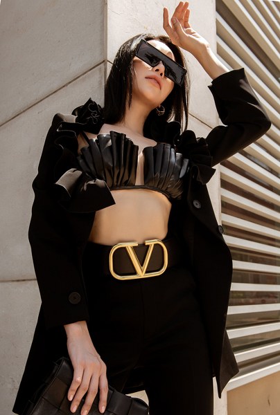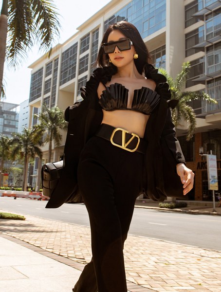 Áo bra thiết kế trên chất liệu da với hình ảnh vỏ sò được Trà Ngọc Hằng sử dụng để khoe vòng eo \"con kiến\" khi xuống phố.