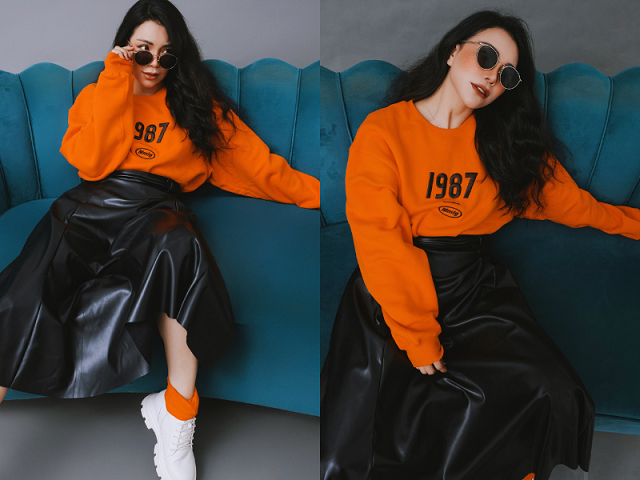 Ở set đồ đầu tiên, Trà Ngọc Hằng diện áo cam tay dài phối với váy da đen, vừa tạo sự nữ tính dịu dàng nhưng cũng không kém phần cá tính cho người mặc.