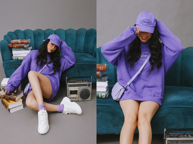 Trong bộ 2, Trà Ngọc Hằng lăng xê gam màu tím khi diện set đồ gồm áo dạng hoodie với nón, phù hợp để diện trong những chuyến đi chơi chào hè.