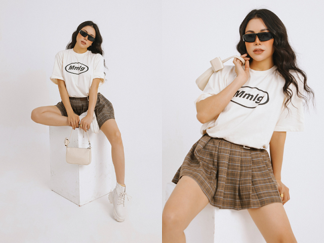 Ở set đồ cuối, Trà Ngọc Hằng khoe sắc vóc khi chọn váy ngắn lộ đôi chân dài và kết hợp áo thun cùng áo khoác dài tay. Được biết, thời gian gần đây, cô là đại diện phân phối MMLG từ Hàn Quốc tại Việt Nam.